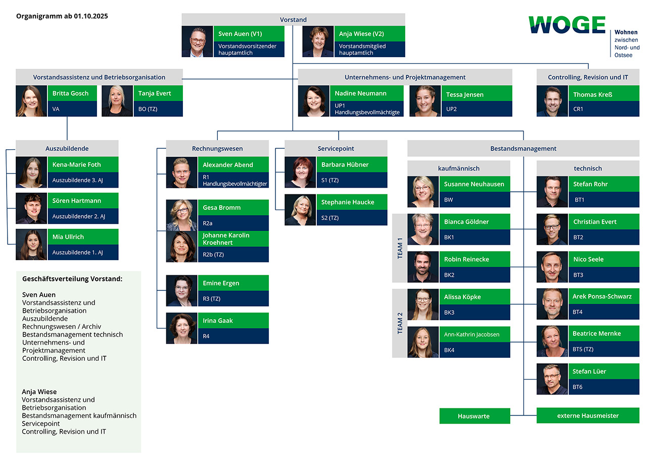 Gegründet im Jahr 1926 als Postbauverein Kiel eG entwickelt sich unser Unternehmen – seit 1996 unter seinem heutigen Namen WOGE Wohnungs-Genossenschaft Kiel eG – kontinuierlich weiter. Was mit wenigen Wohnungen begann, ist heute eine in Schleswig-Holstein regional tief verwurzelte Wohnungsgenossenschaft. Mittlerweile bewirtschaften wir rund 2.300 Wohnungen in 11 Städten und Gemeinden im nördlichsten Bundesland. Unsere Philosophie aber war, ist und bleibt immer gleich: Solidarität und Vertrauen, Transparenz und Gleichberechtigung – das sind Werte, die für Unternehmen wie die WOGE nicht aus der Mode kommen. Im Gegenteil! Denn der genossenschaftliche Wertekodex entspricht unserer Überzeugung. Unser Team setzt sich Tag für Tag aktiv dafür ein, unsere Genossenschaft zu stärken und das Unternehmen für die Zukunft stark zu machen.